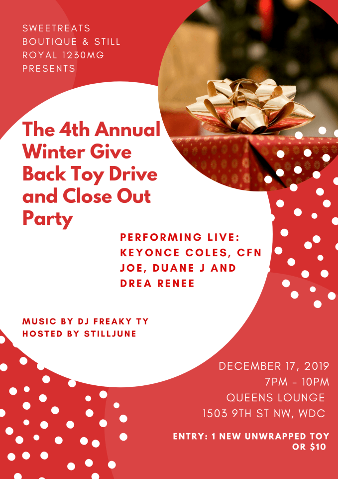 Over The last 4 years, we have been trying to make an impact on the less fortunate during the season of giving. The Winter Give Back started as a way to give back the blessings that we have received over the year. 3 years later we are proud to say that with the help of so many, we have donated over $4000 worth of toys to homeless children in DC, and supported other holiday drives as well. This year we are back for our 4th anniversary. To celebrate this occasion, we are having a party at Queens Lounge (1503 9th St NW, Washington DC) on December 17th from 7pm to 10. The event is 21 and up and we are accepting 1 new unwrapped toy or a $10 donation to enter. There will be a raffle and we have a great line up of artist ready to give you all an incredible show. We will also be accepting donations via gofundme (Link Posted Below) until December 20th. Toys will be donated through Community Partnership. We look forward to seeing you all on Tuesday and thank you for your participation over the years. We are very fortunate to have your help with this effort. Enjoy the holiday season.